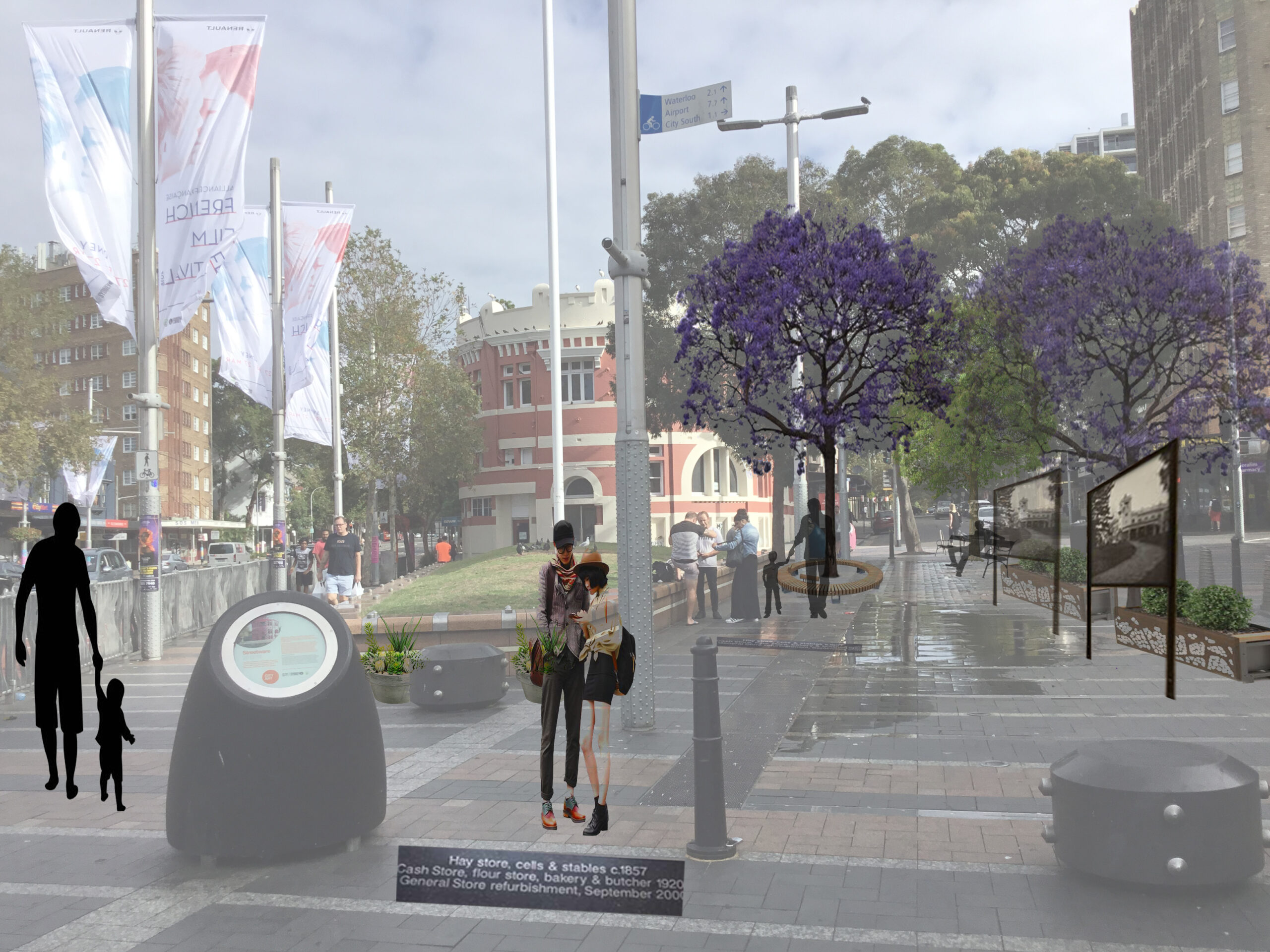 Our Masters project (2018) reimagined Taylor Square, Sydney’s vibrant Darlinghurst hub, through a heritage interpretation intervention, celebrating its role as a cultural and social crossroads. Born in the 19th century amid Georgian and Victorian streetscapes, Taylor Square evolved into the heart of Sydney’s LGBTQ+ community, its streets echoing colonial roots and modern inclusivity. Our extensive study mapped its heritage architecture, from the 1844 Darlinghurst Courthouse to Oxford Street’s eclectic facades, using archival research and site surveys. The interpretive strategy introduced Victorian-inspired street furnishings, walls adorned with murals tracing Sydney’s history, and floor slabs engraved with narratives of cultural milestones. Designed for all ages, pedestrian-friendly walkways and tactile paving ensured accessibility, fostering community connection. Aligned with ICOMOS principles and NSW heritage guidelines, our vision transformed Taylor Square into an immersive historical canvas, weaving its storied past into a dynamic, inclusive present for residents and visitors alike.